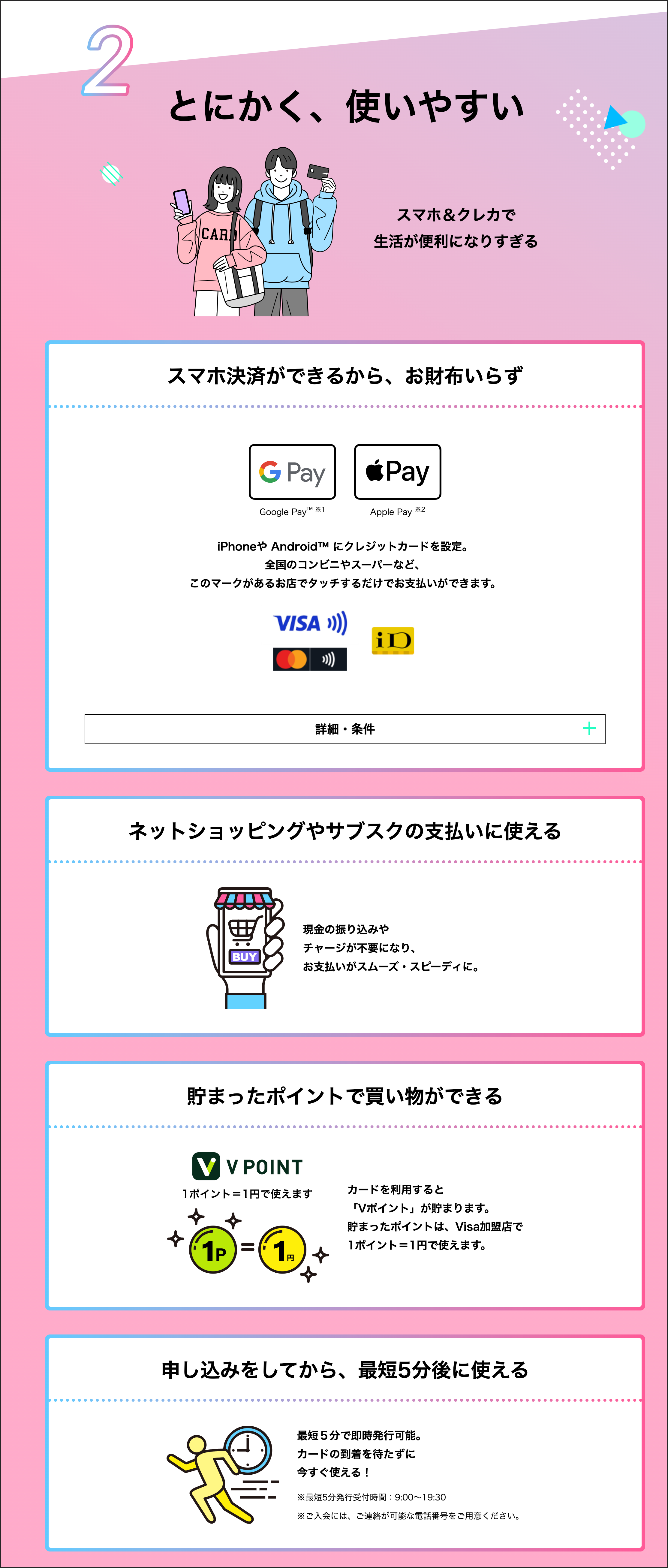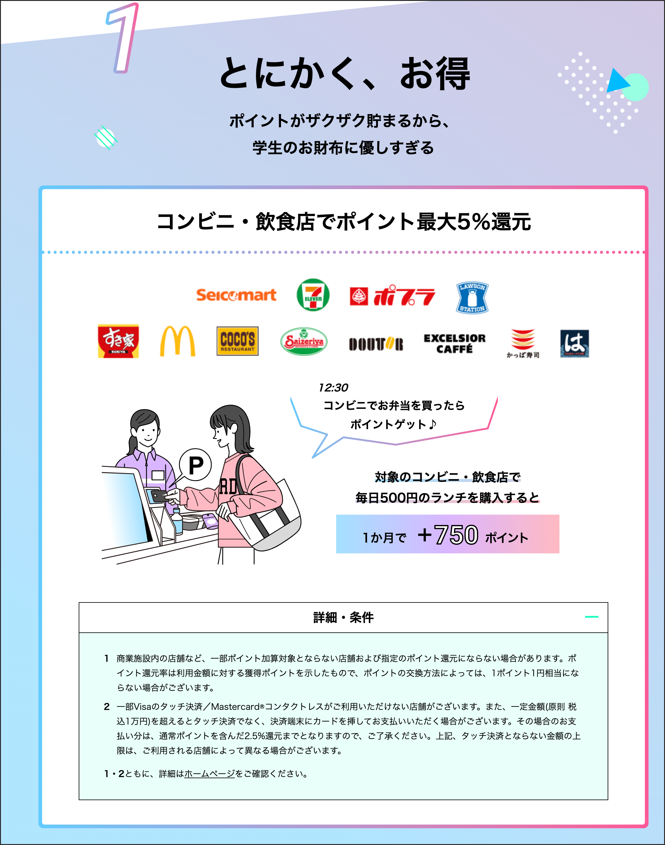 VISAタッチという機能を推しているのですが、一部のコンビニで利用できないのが残念です。 また、コンビニ利用などのポイント還元率は高くてお得に利用することが可能ですが、それ以外の買い物はポイント還元率が0.5%と、今ひとつに感じてしまう点もあるかと思います。