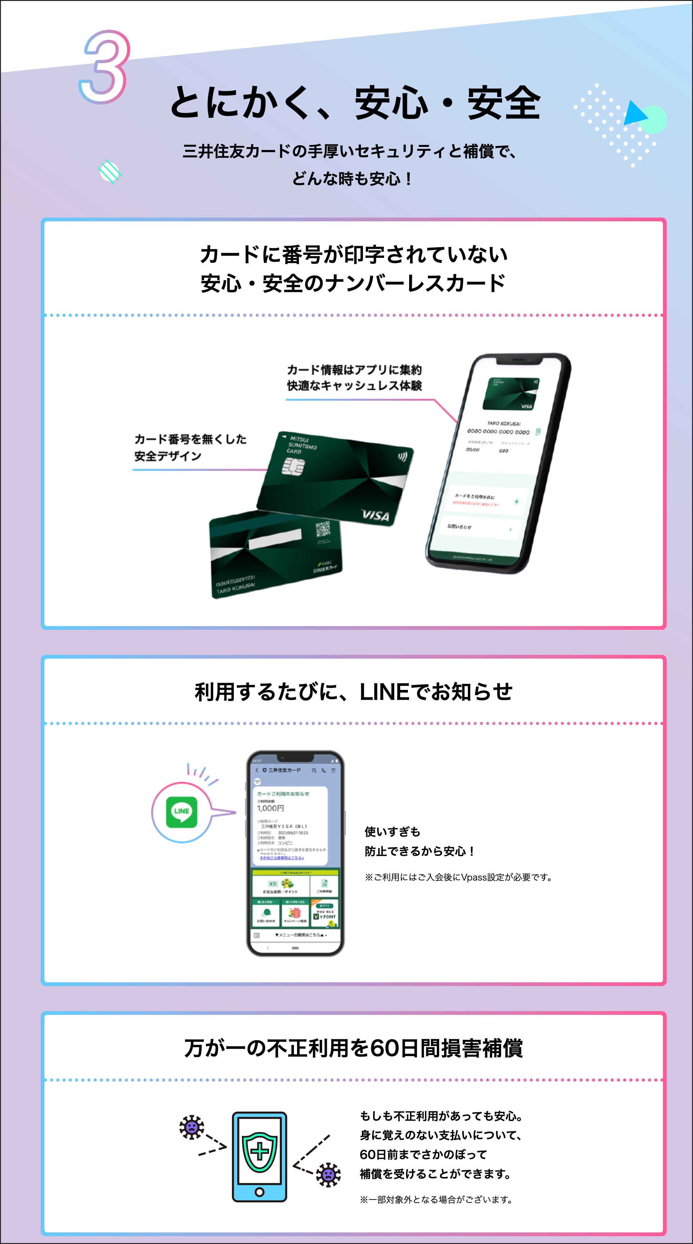 利用状況は常にスマホで確認可能なうえ、不正利用は60日分保証されるので無くした時でも安心!