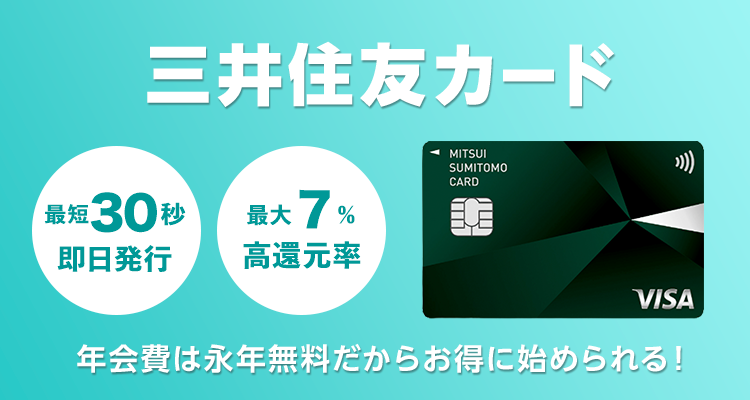 ※即時発行ができない場合があります※特典付与には条件・上限があります。詳細は三井住友カードのホームページをご確認ください。 ※ポイント還元率は利用金額に対する獲得ポイントを示したもので、ポイントの交換方法によっては、1ポイント1円相当にならない場合があります。 ※最大7%内訳(通常ポイント0.5%+スマホのタッチ決済利用6.5%) ※商業施設内の店舗など、一部ポイント加算の対象とならない店舗があります。 ※iD、カードの差し込み、磁気取引は対象外です。カード現物のタッチ決済の還元率は異なります。 ※一定金額(原則1万円)を超えると、タッチ決済でなく、決済端末にカードを挿しお支払いただく場合がございます。 その場合のお支払い分は、タッチ決済分のポイント還元の対象となりませんので、ご了承ください。 上記、タッチ決済とならない金額の上限は、ご利用される店舗によって異なる場合がございます。 ※ポイント還元率は利用金額に対する獲得ポイントを示したもので、ポイントの交換方法によっては、1ポイント1円相当にならない場合があります。 ※Google Pay™ 、Samsung Walletで、Mastercard®タッチ決済はご利用いただけません。ポイント還元は受けられませんので、ご注意ください。