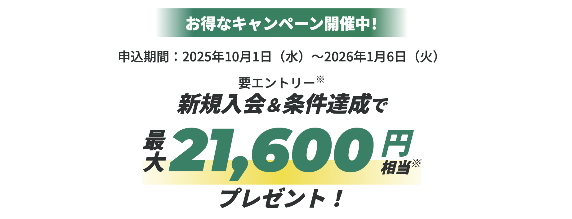 - 新規入会&条件達成で最大21,600円分プレゼント!