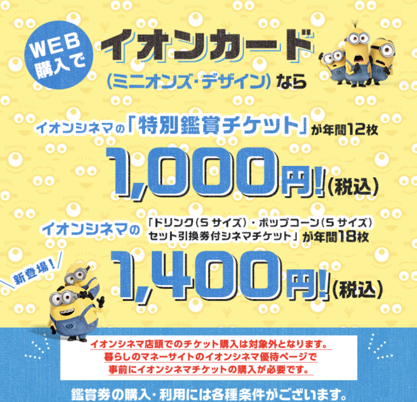 ・対象カード会員さまが「暮らしのマネーサイト」専用販売サイトにて、イオンシネマで利用可能なシネマチケット(前売券)を優待料金で購入いただける特典です。劇場での直接購入は一般料金からの「イオンカード割引き」が適用されますのでご注意ください。